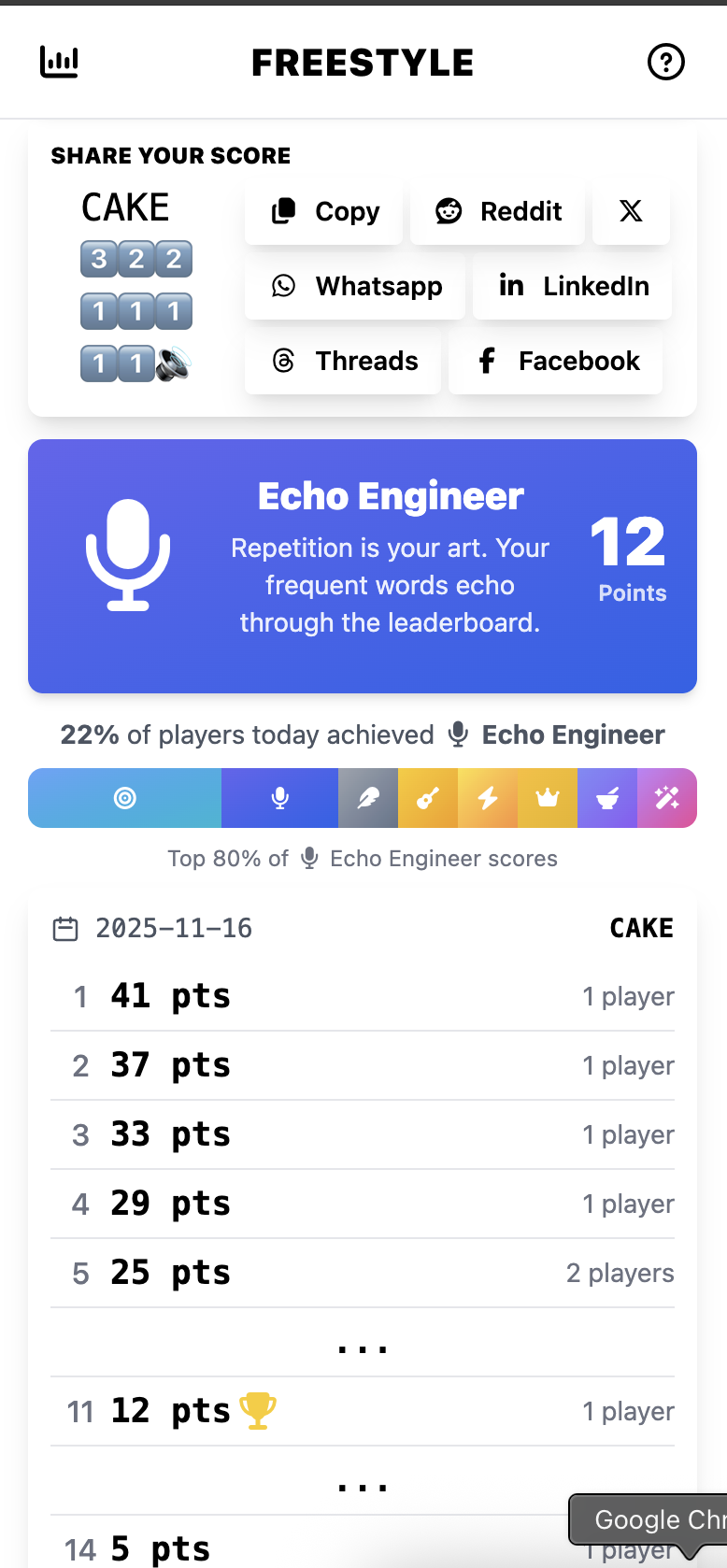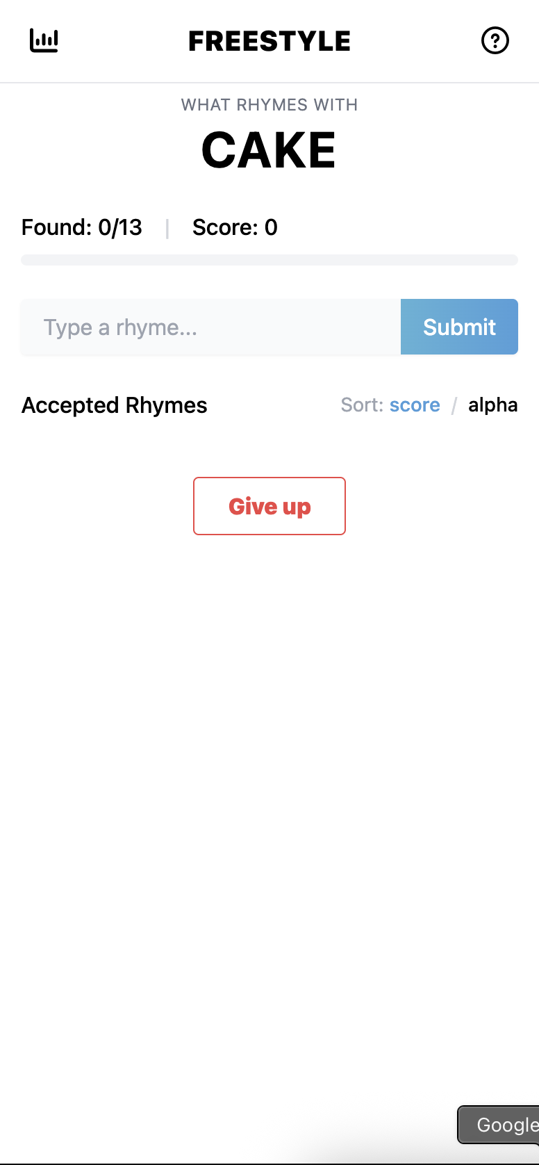 Freestyle is a daily rhyming word game. You get a new word every day; the object of the game is to find thirteen rhymes. Longer rhymes get you more points. It’s a good way to test your vocabulary skills, learn new words, and/or flex on your friends. At least, we think so.