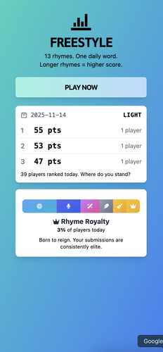 The game is (hopefully!) pretty simple: you get a word of the day and your job is to find rhymes with the word of the day, longer words get you more points.